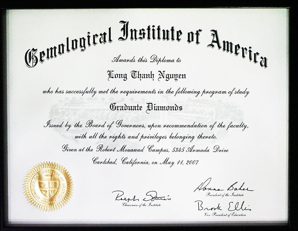 Bằng Chuyên Viên Ngọc Học và Bằng Chuyên Viên Kim Cương được GIA-Viện Ngọc Học Hoa Kỳ cấp cho ông Nguyễn Thành Long-Giám Đốc Kinh Doanh của Công ty